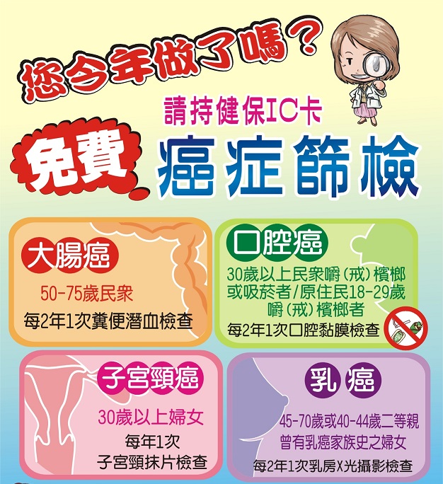 | 消息標題: | 癌症篩檢介紹(大腸癌、口腔癌、子宮頸癌、乳癌) |