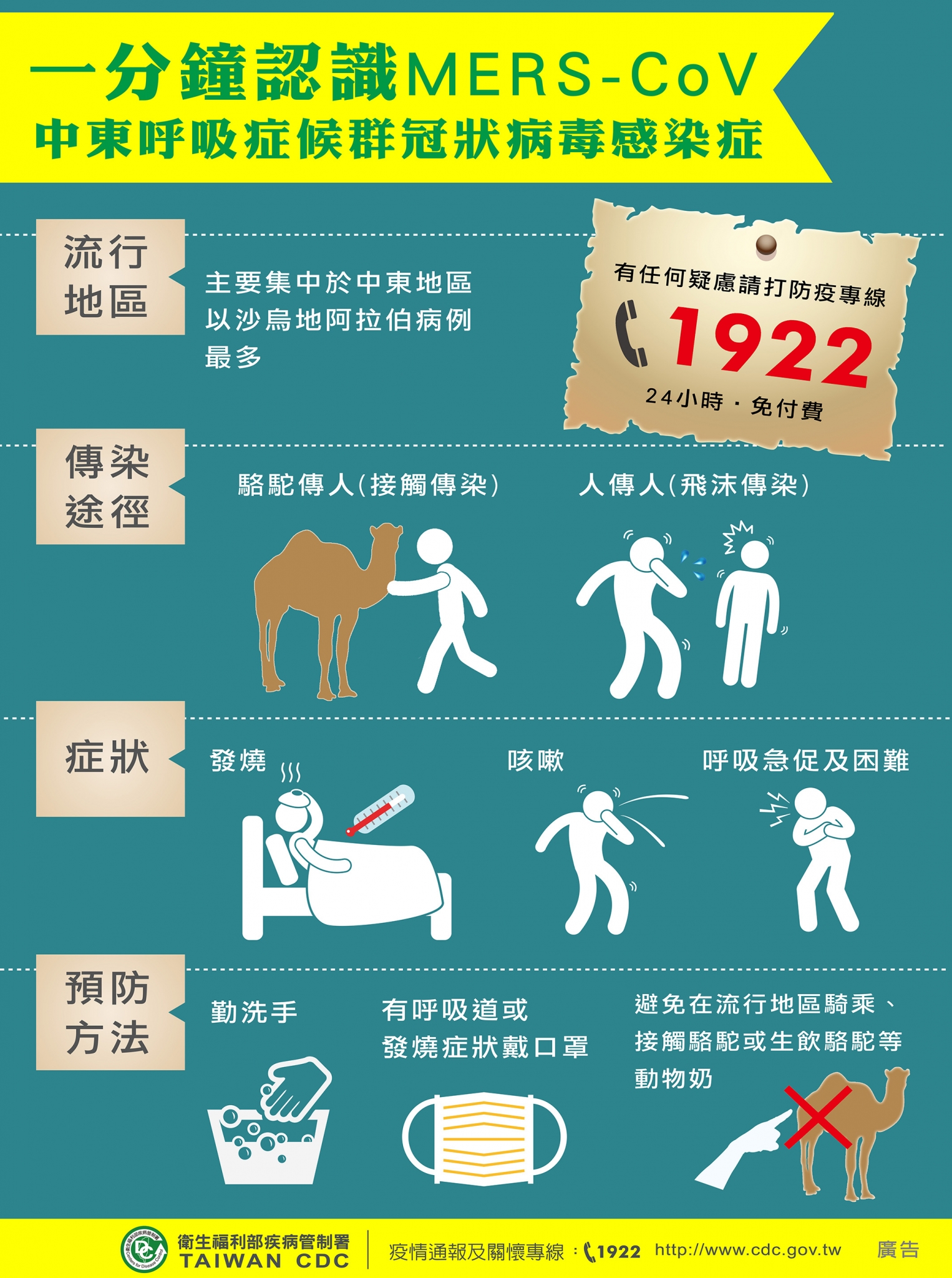 1、欲赴中東地區的民眾,請提高警覺並注意個人衛生及手部清潔,同時儘量減少至人群聚集或空氣不流通的地方活動,或與有呼吸道症狀者密切接觸。此外應避免前往當地農場、接觸駱駝或生飲駱駝等動物奶,以降低受感染可能性。