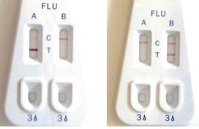 目前市面上有多種不同廠牌的流感快篩試劑,流感快篩結果的呈現方式,一般都有控制線(C)和測試線(T)兩條紅線,當在A型(或B型)流感反應區出現兩條紅線,表示測試結果為該型流感陽性(如下圖);當測試片只出現控制線(C)時表示,測試結果為陰性;檢測結果陽性者,可以初步判定患者感染流感病毒,醫師可依此考量給予及時的抗流感藥物治療。