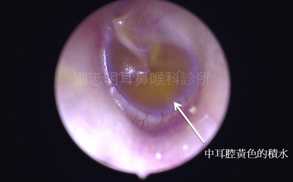 圖二及圖三:中耳腔耳膜的後面有明顯的黃色積水,正常的耳膜不應該有這個顏色,應該是透光的,黃色的積液也代表有一段時間了,顏色才會偏深黃色。