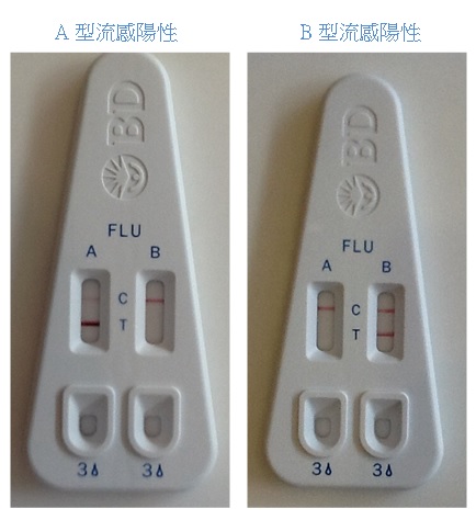 快速病毒抗原檢查,簡稱「快篩」,是利用抗原與抗體互相反應的原理來檢測病毒的有無,在流感流行的時候,流感快篩檢查可以提供快速的診斷,方便儘早使用流感的特效藥,加速症狀的復原,下圖分別有流感快篩「A型流感陽性」及「B型流感陽性」反應的圖像,在對照紅色線以外所多出來紅色的線,即表示陽性反應。