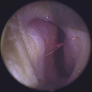 這是一個小孩鼻部流鼻血的照片,小朋友過敏性鼻炎常會忍不住抓鼻孔、揉鼻子造成鼻黏膜受傷,圖中左側是鼻中隔,右側是鼻甲骨及腫脹的鼻黏膜,圖中可以看到在鼻中隔的位置有一個出血點,這是鼻子最容易出血的位置,大約就在鼻孔進去不到1公分的距離,不管是揉鼻子或是挖鼻孔都是容易在這位置製造傷口。