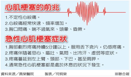 『心肌梗塞經常在瞬間奪命,但是都早有前兆,只是多數人不在意,認為是太累、感冒,在椅子或躺上床休息即可,「稍微走動一下就喘不過氣,或根本沒做什麼事就胸口悶痛、心絞痛還冒冷汗,很可能就是心肌梗塞的前兆,一定要趕快求醫」』。