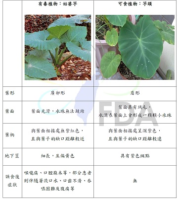 「姑婆芋 (Alocasia odora)」,又稱山芋、觀音蓮、天荷等。姑婆芋植株與芋頭相似,芋頭 (Colocasia esculenta)葉面具有絨毛,葉柄與葉面相接處呈深紫色,且與葉子的缺口距離較遠,姑婆芋表面光滑,水珠無法凝結,葉柄與葉面相接處無紫紅色,且與葉子的缺口距離較近,兩者在野外不容易辨識,姑婆芋植株全株有毒,含草酸鈣、氫氰酸及生物鹼會使誤食民眾出現喉嚨痛、口腔麻木等症狀,部分患者則伴隨著流口水、口齒不清、吞嚥困難及腹痛等。