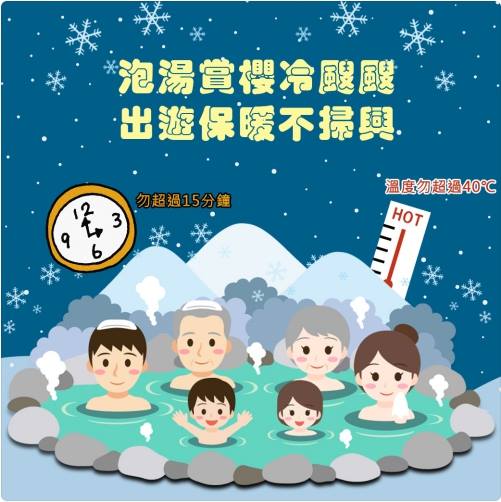 此外,不少民眾也會把握假期泡溫泉驅走寒意,在上ㄧ波冷氣團來襲,一位60歲中年男子與太太一起去泡湯,剛泡溫泉沒多久突然覺得頭暈、冒汗,伴隨噁心胸悶,太太嚇得趕緊陪同就醫。提醒您,心血管疾病與年長者,泡湯時勿超過15分鐘、泡湯後勿太快起身、勿單獨泡個人池、溫度勿超過40℃、避免冷熱水交替,泡湯前後都應喝足水份、以及飲酒或吃大餐後隔1.5小時以上再泡。
