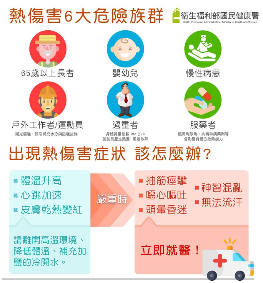 近年夏季高溫屢創新高,國外頻傳炎熱高溫造成熱衰竭送醫數增加,更有數十人因高溫而送命;位於亞熱帶氣候的臺灣除高溫外亦常伴隨高濕度,6大高危險族群慎防熱傷害!如果不適時作好防護措施又大量流汗,就可能造成脫水。