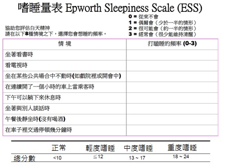 如果您有類似困擾,您也可以做以下的問卷,看白天嗜睡的情形明不明顯,由此來推斷推測晚上睡眠打呼的可能性。