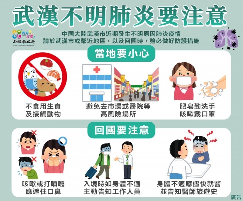寒假及農曆春節期間,民眾出國旅遊、返鄉探親等兩岸間交通運輸及流動人次更加密集,籲請民眾如需前往武漢及其鄰近區域,保持個人手部及呼吸道良好衛生習慣,避免接觸野生動物及急性呼吸道感染症患者,也避免出入傳統市場及醫療院所。如自武漢及其鄰近區域返國入境有發燒、咳嗽等身體不適,無論是否服退燒藥、止咳藥,都應主動向機場及港口檢疫人員報到;返國14日內出現有發燒、呼吸道症狀時,應配戴口罩儘速就醫,並告知醫師旅遊及接觸史以利診斷及治療。