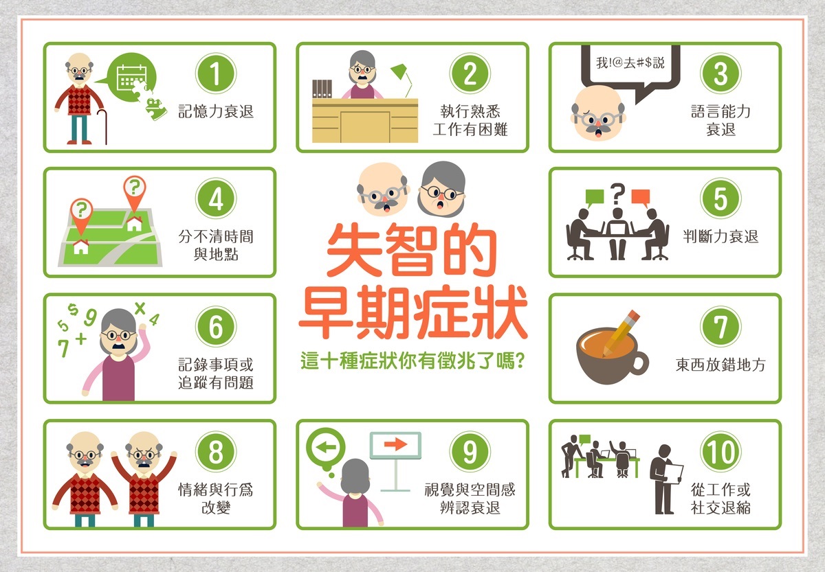 失智症是一種疾病,而不是正常的老化,很多民眾誤以為人老了就會失智,因而忽略了就醫的重要性,如因「記憶力減退導致影響日常生活」,出現重複發問、重複購物或重複服藥,無論怎麼提醒也想不起來;或「出現言語表達或書寫有困難」,無法清楚表達送信的人是郵差;或「無法勝任原本熟悉的事務」,例如長年處理家庭大小事的家庭主婦,突然不知道該怎麼幫家人準備晚餐等失智症警訊,皆非正常的老化現象,應盡快至精神內科或記憶門診接受進一步檢查和診斷。