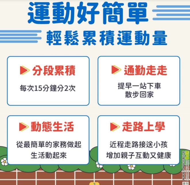 建議國人每天運動至少30分鐘,分段累積運動量,效果與一次做完一樣,不過每次至少要連續10 分鐘。例如每天應至少運動30分鐘,可以拆成2次15分鐘,或3次10分鐘完成。糖友們~運動可以