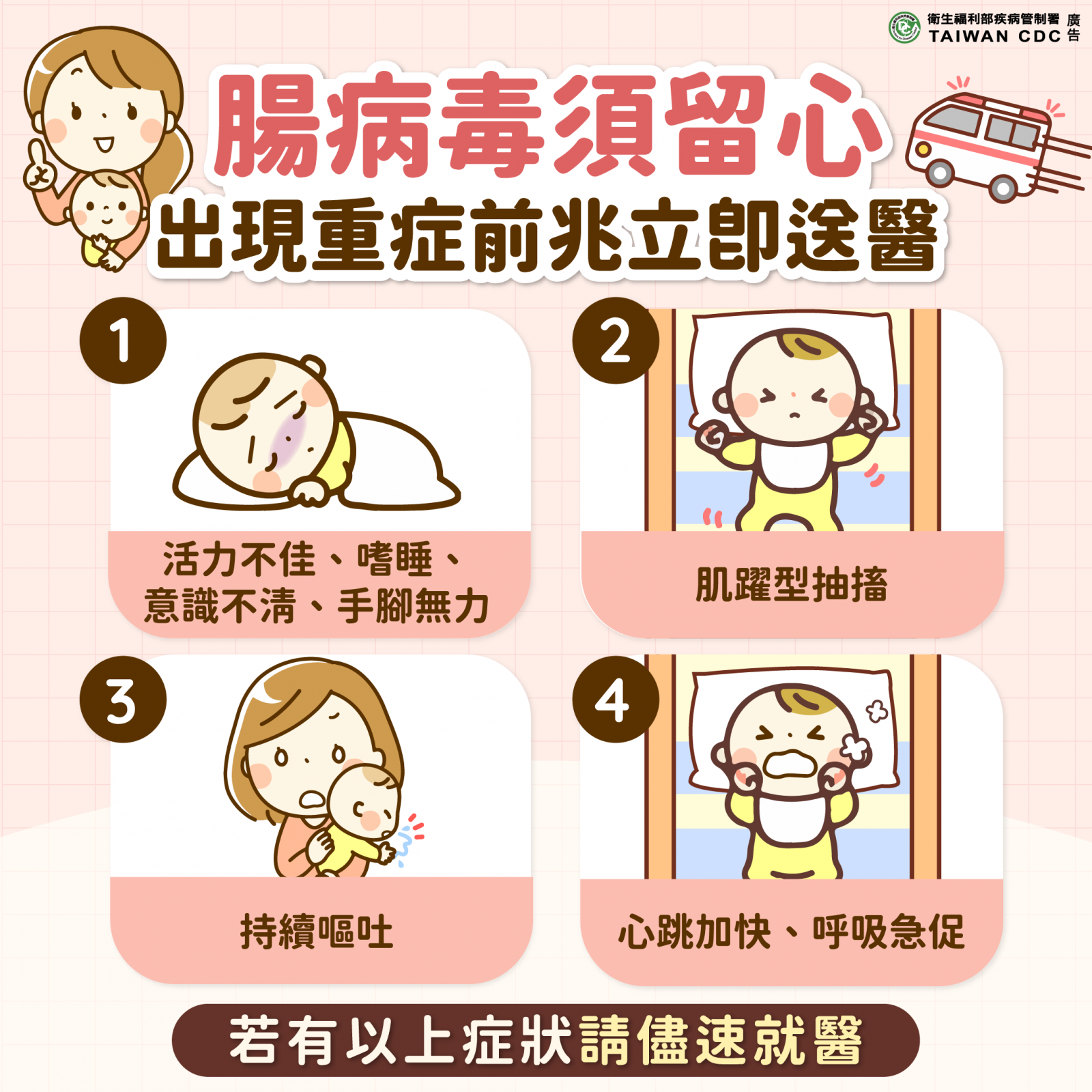 疾管署提醒,部分患者感染腸病毒後,因僅有類似感冒的輕微症狀,不易察覺及預防,而成為潛在傳染源,因此請民眾特別注意自身與嬰幼兒的衛生習慣,尤其大人返家務必先更衣、以肥皂洗手後再抱小孩,且無論是大人或是小孩,皆應落實肥皂勤洗手,尤其是「吃東西前、跟小寶寶玩前、擤鼻涕後、上廁所後以及看病前後」,且要確實做到「濕、搓、沖、捧、擦」洗手五步驟,以降低腸病毒傳播的風險。