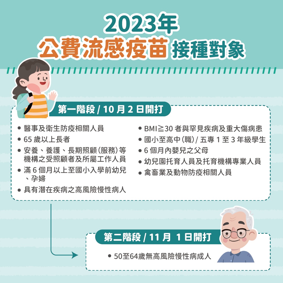 今(112)年度公費流感疫苗分2階段開打,第1階段於10月2日起開打,對象包括65歲以上長者、學齡前幼兒、醫事及衛生防疫相關人員等11類對象;第2階段自11月1日開始,對象為50至64歲無高風險慢性病成人。疾管署呼籲符合公費接種資格民眾開打後儘速預約接種,且65歲以上長者亦可與莫德納XBB.1.5疫苗或肺炎鏈球菌疫苗同時接種。